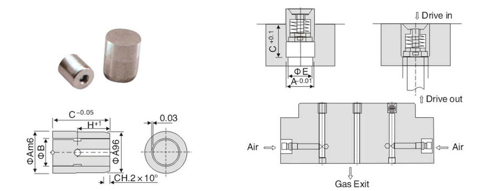 設計應用在熱塑性模具方面, 通過透氣鋼來保證正確功能的使用 。 工作氣壓 / air pressure:1.5~6BARS