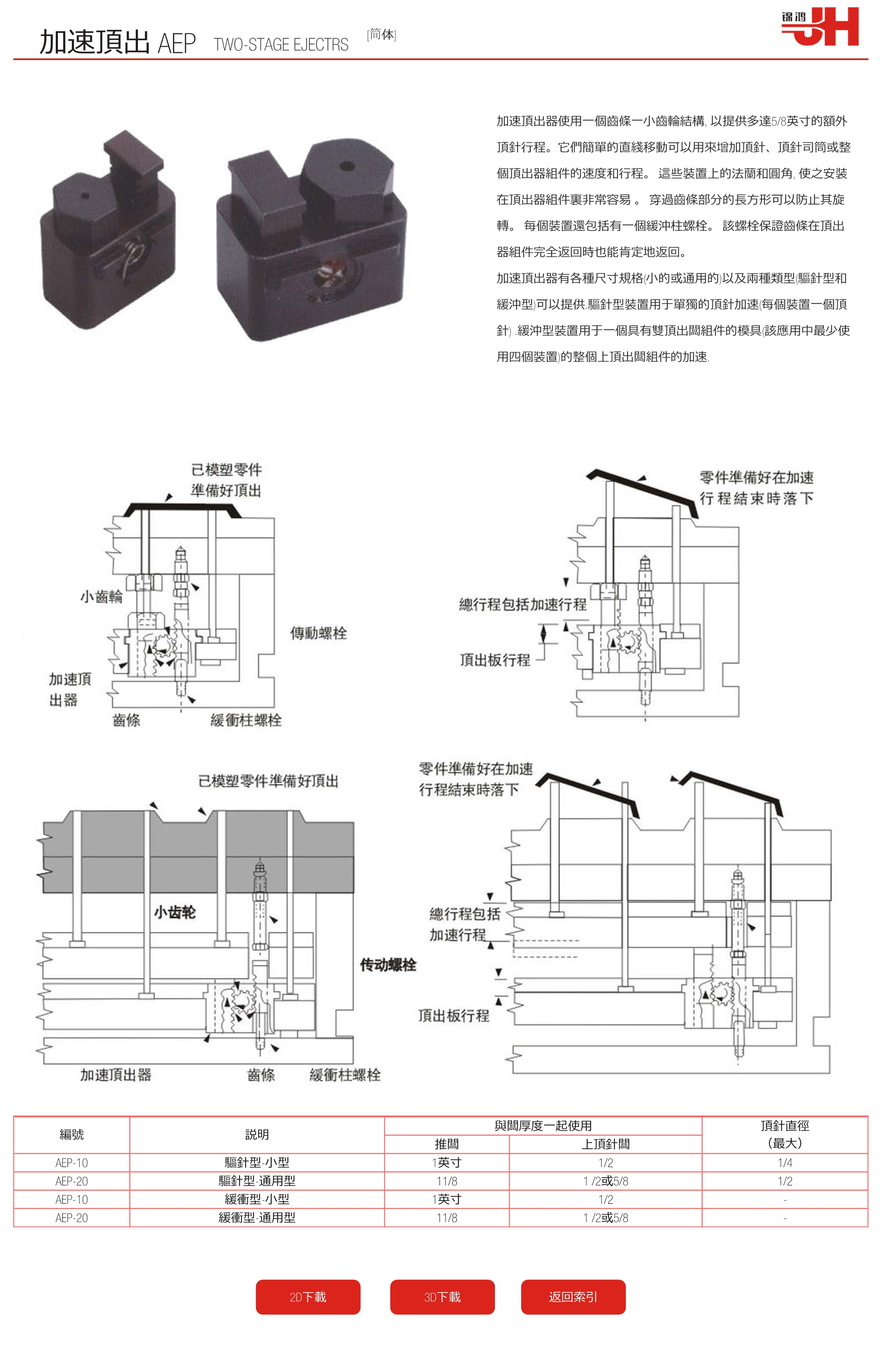 加速頂出器使用一個(gè)齒條一小齒輪結(jié)構(gòu), 以提供多達(dá)5/8英寸的額外頂針行程。它們簡單的直綫移動(dòng)可以用來增加頂針、頂針?biāo)就不蛘麄€(gè)頂出器組件的速度和行程。 這些裝置上的法蘭和圓角, 使之安裝在頂出器組件裏非常容易 。 穿過齒條部分的長方形可以防止其旋轉(zhuǎn)。 每個(gè)裝置還包括有一個(gè)緩沖柱螺栓。 該螺栓保證齒條在頂出器組件完全返回時(shí)也能肯定地返回。