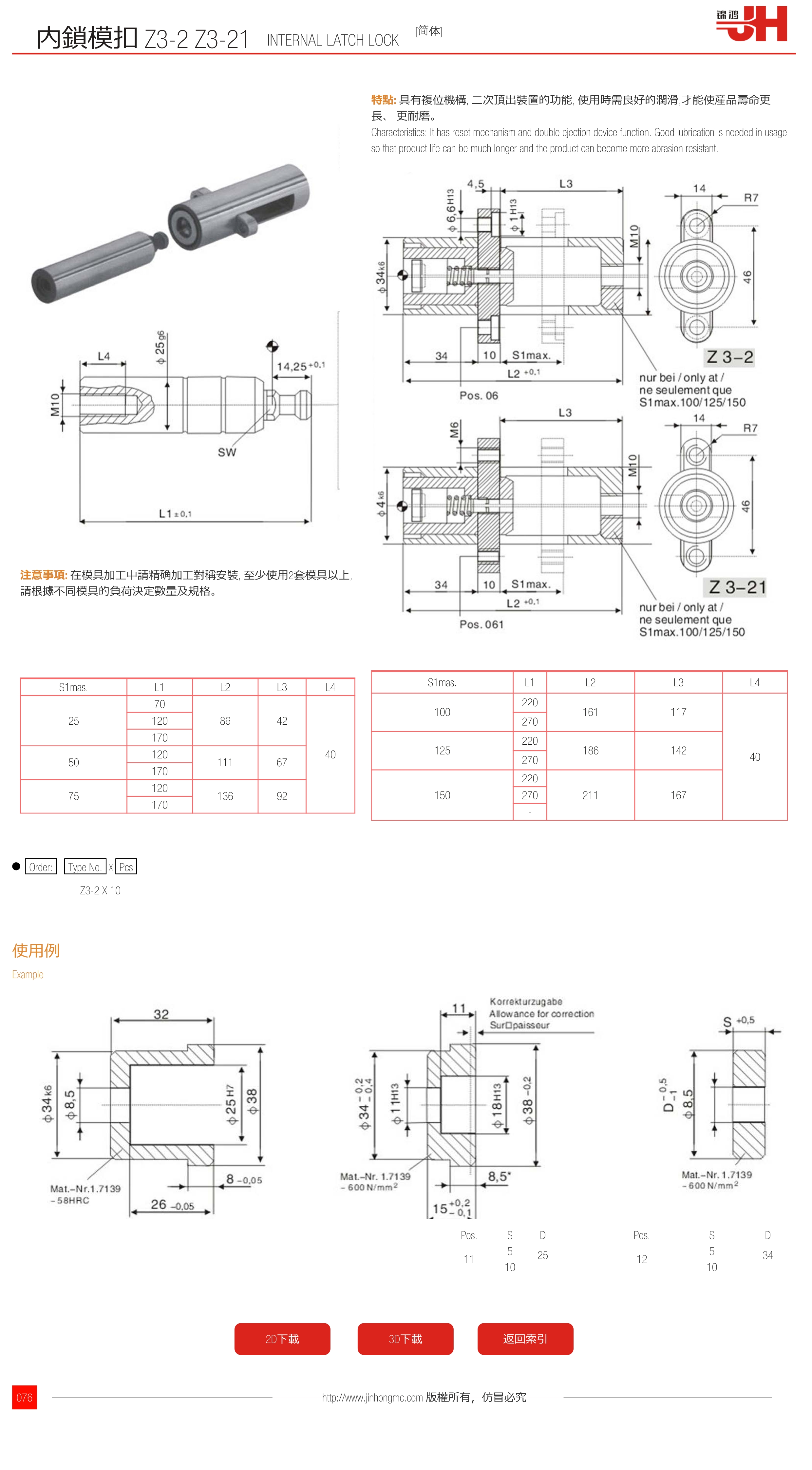 特點: 具有複位機構, 二次頂出裝置的功能, 使用時需良好的潤滑,才能使産品壽命更長、 更耐磨。