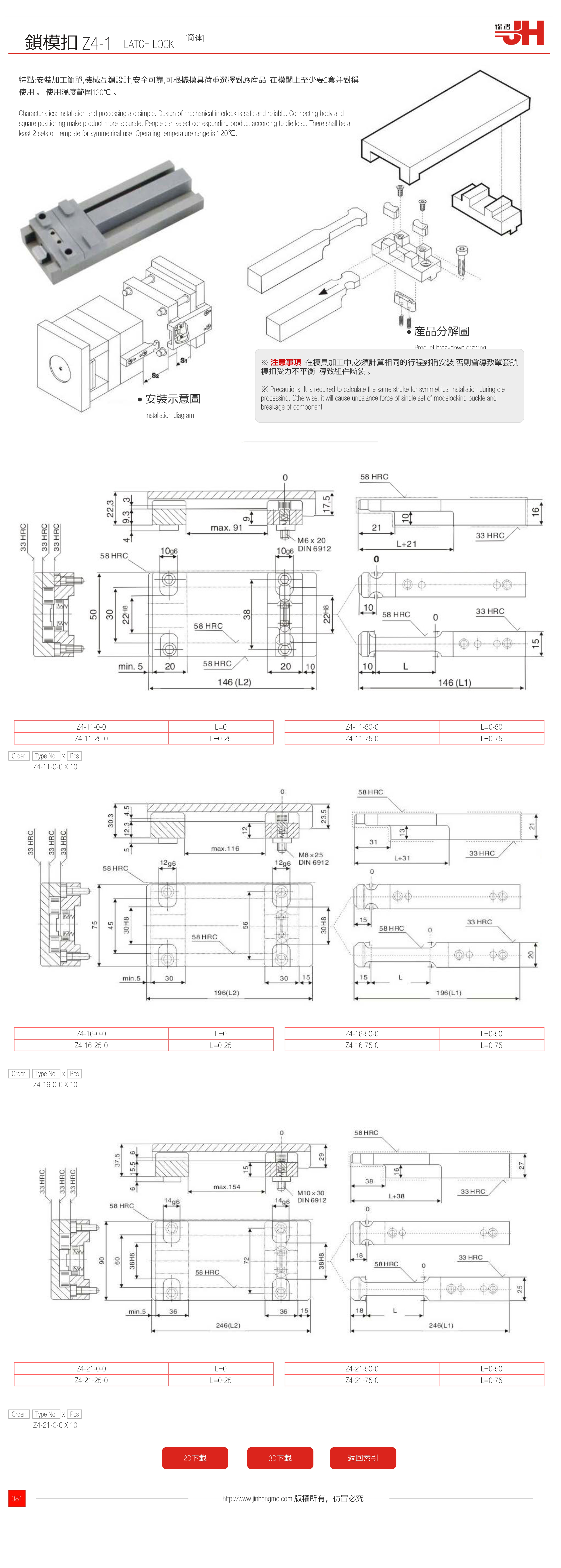 ※ 注意事項 :在模具加工中,必須計算相同的行程對稱安裝,否則會導致單套鎖模扣受力不平衡, 導致組件斷裂 。