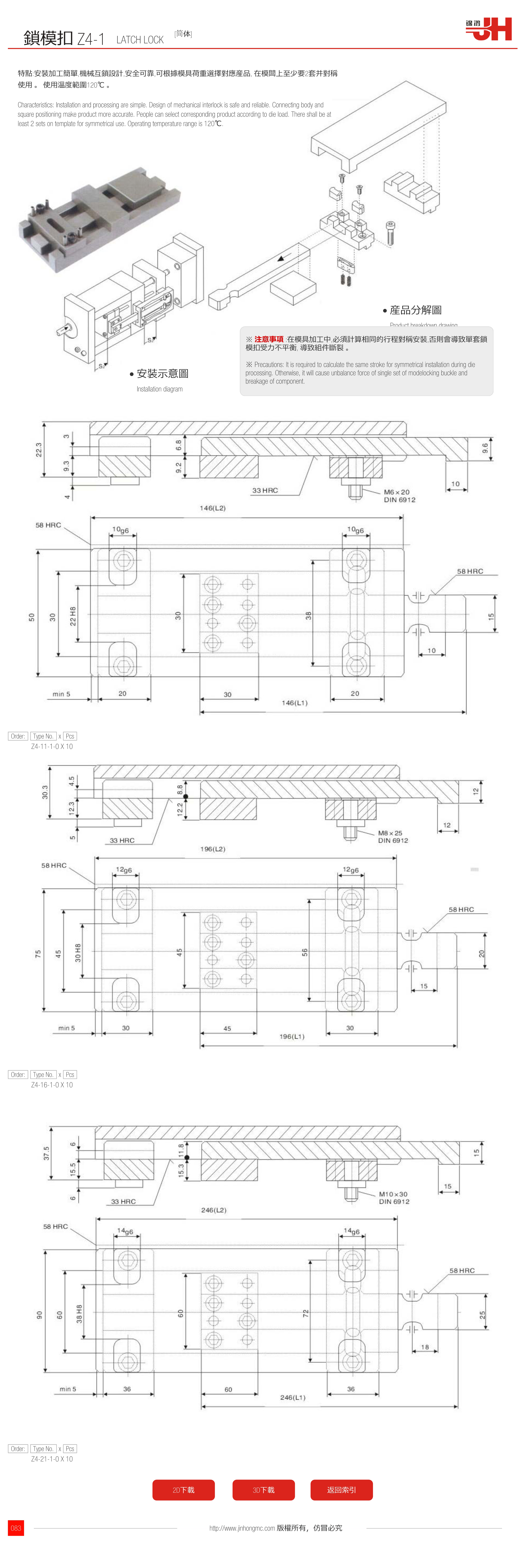 ※ 注意事項 :在模具加工中,必須計算相同的行程對稱安裝,否則會導致單套鎖??凼芰Σ黄胶? 導致組件斷裂 。