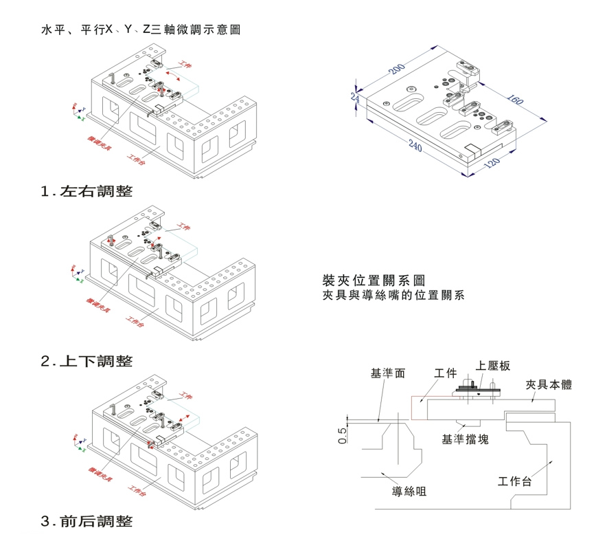 本體具有水平、平行X、 Y、 Z三軸微調功能。