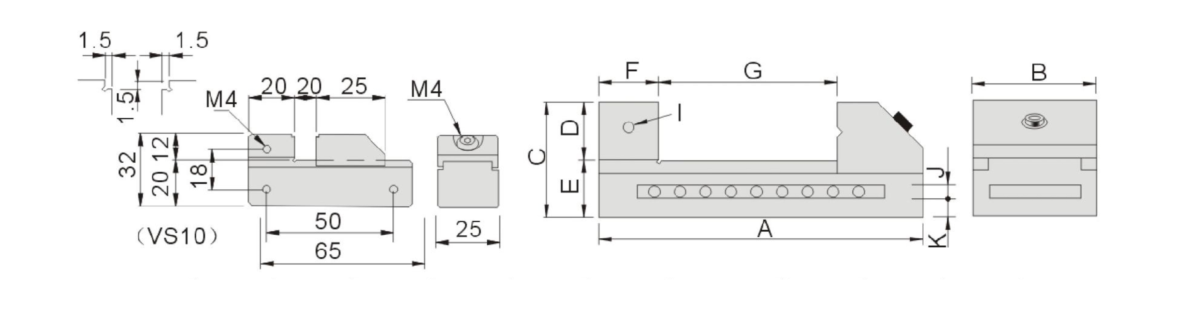| 5720-20 | VS20 | 150 | 50 | 53 | 25 | 28 | 30 | 0-80 | M6 | 8 | 8 | 1.6Kg |