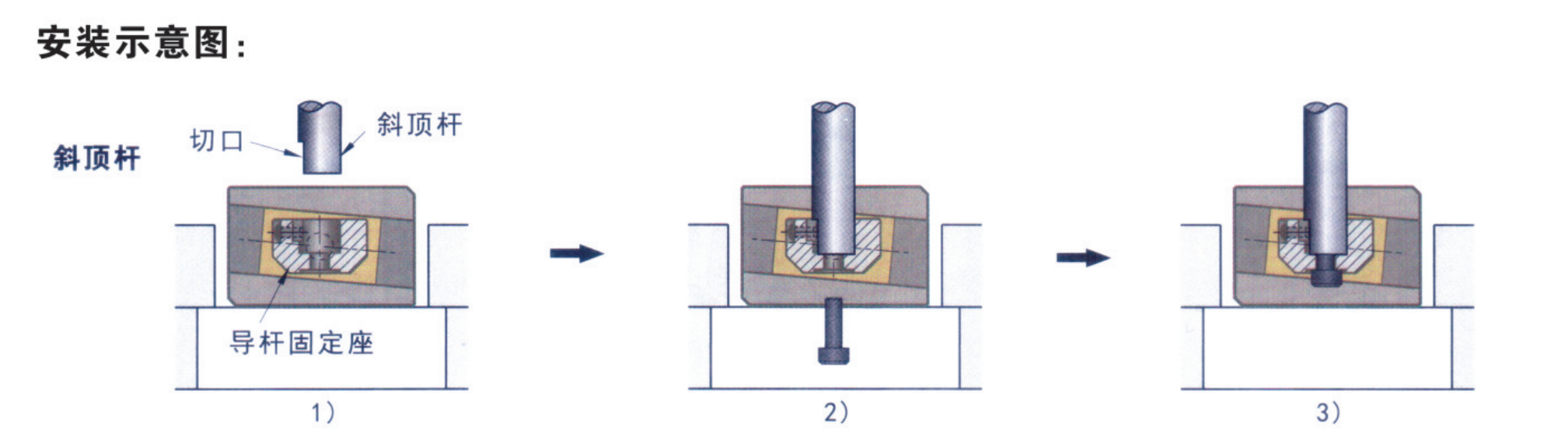 將斜頂桿插入導(dǎo)桿固定座并確保位置;