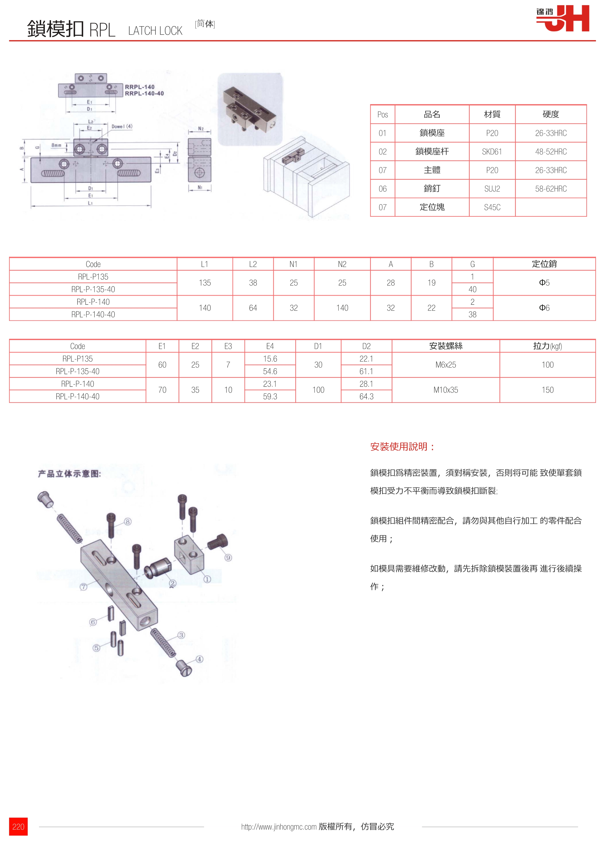 鎖模扣組件間精密配合,請勿與其他自行加工 的零件配合使用;