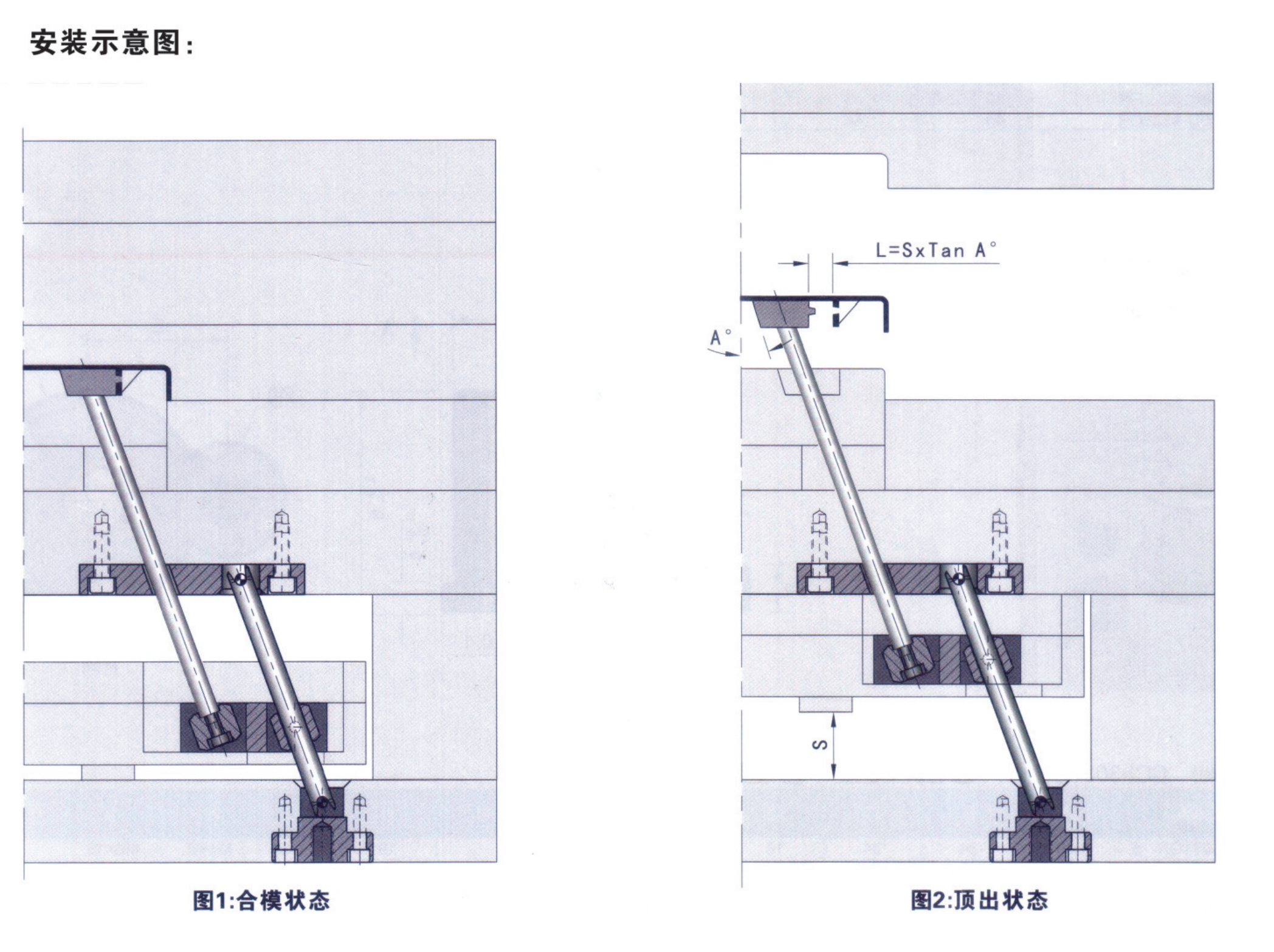 脫模距離L可以通過計算公式:L=SxTanA計算獲得,其中S為頂針板頂出行程,A為安裝角 度,也可以使用CAD軟件模擬計算獲得。