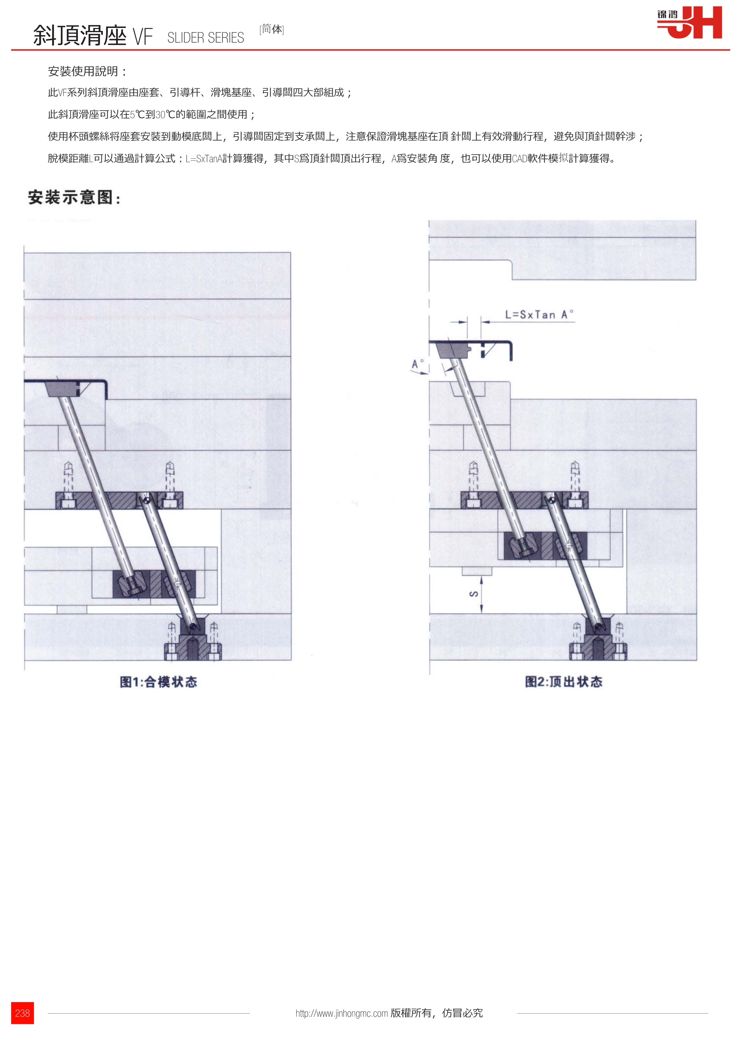此VF系列斜頂滑座由座套、引導桿、滑塊基座、引導板四大部組成;