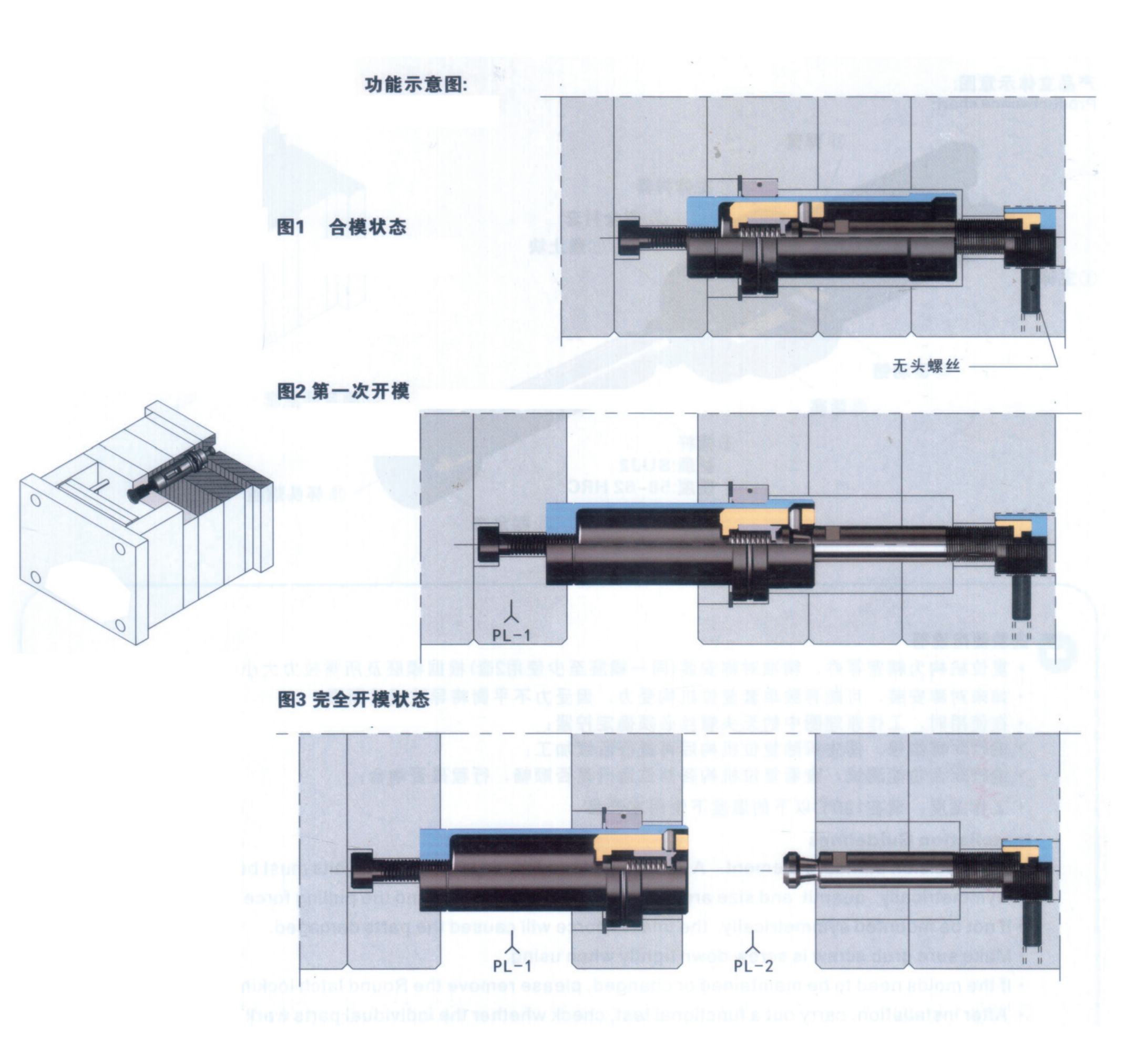 第二次開模狀態(tài):第一次開模行程完成時(shí),通止塊釋放插桿同時(shí)將主體與主體襯套 鎖住,插桿便可拔離襯套,第二次分型面完成打開。
