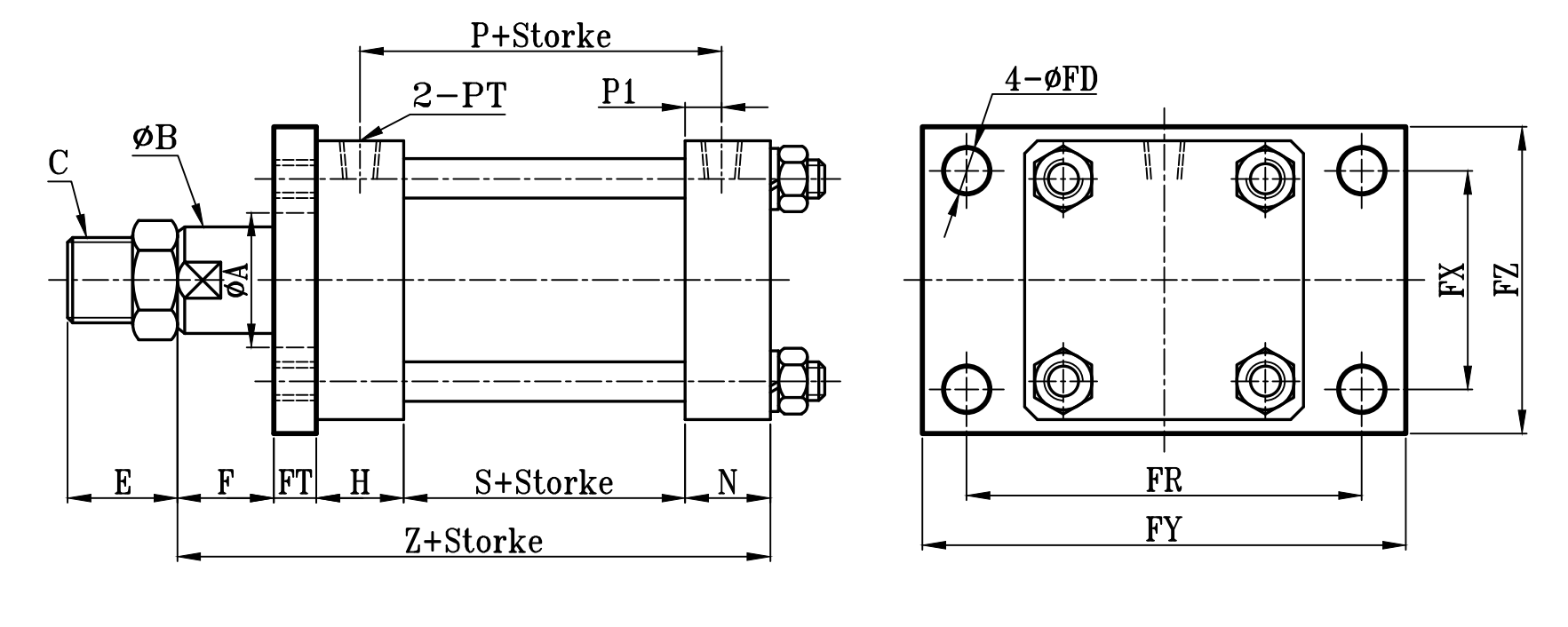 | 缸徑 BORE | ΦA | ΦB | C | E | F | G | H | N | P | P1 | PT | S | Z | ZD | ΦFD | FT | FR | FX | FY | FZ |