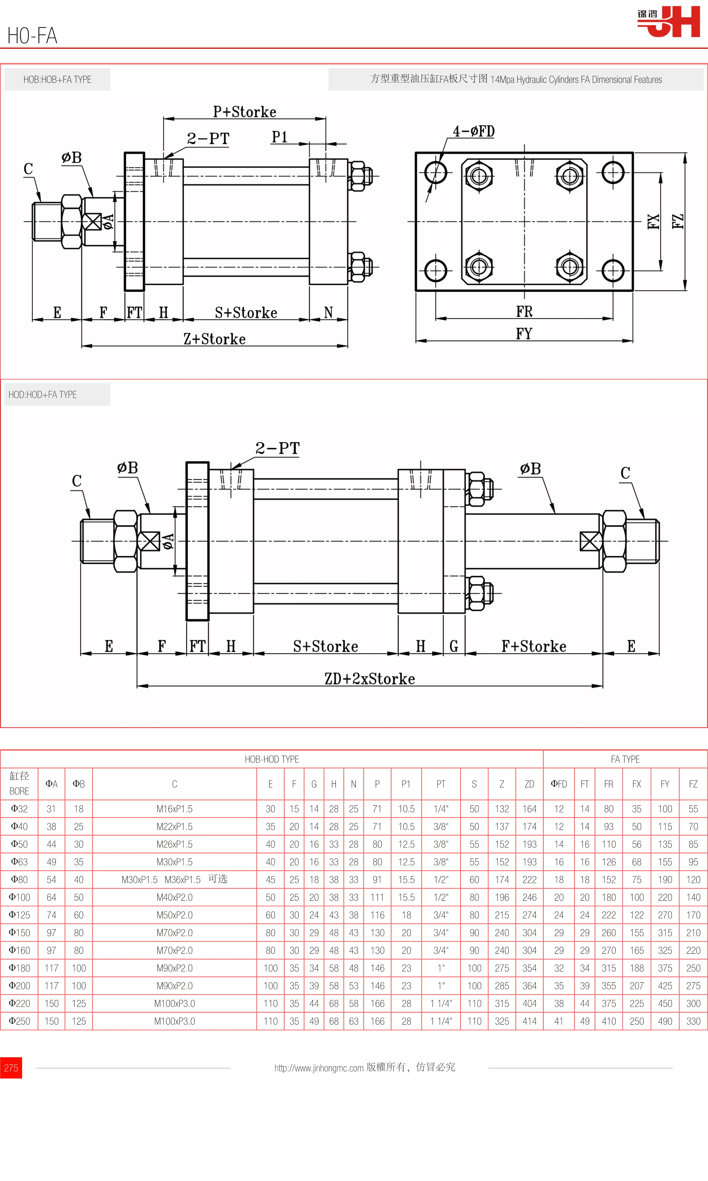 HOB:HOB+FA TYPE | 方型重型油壓缸FA板尺寸圖 14Mpa Hydraulic Cylinders FA Dimensional Features |