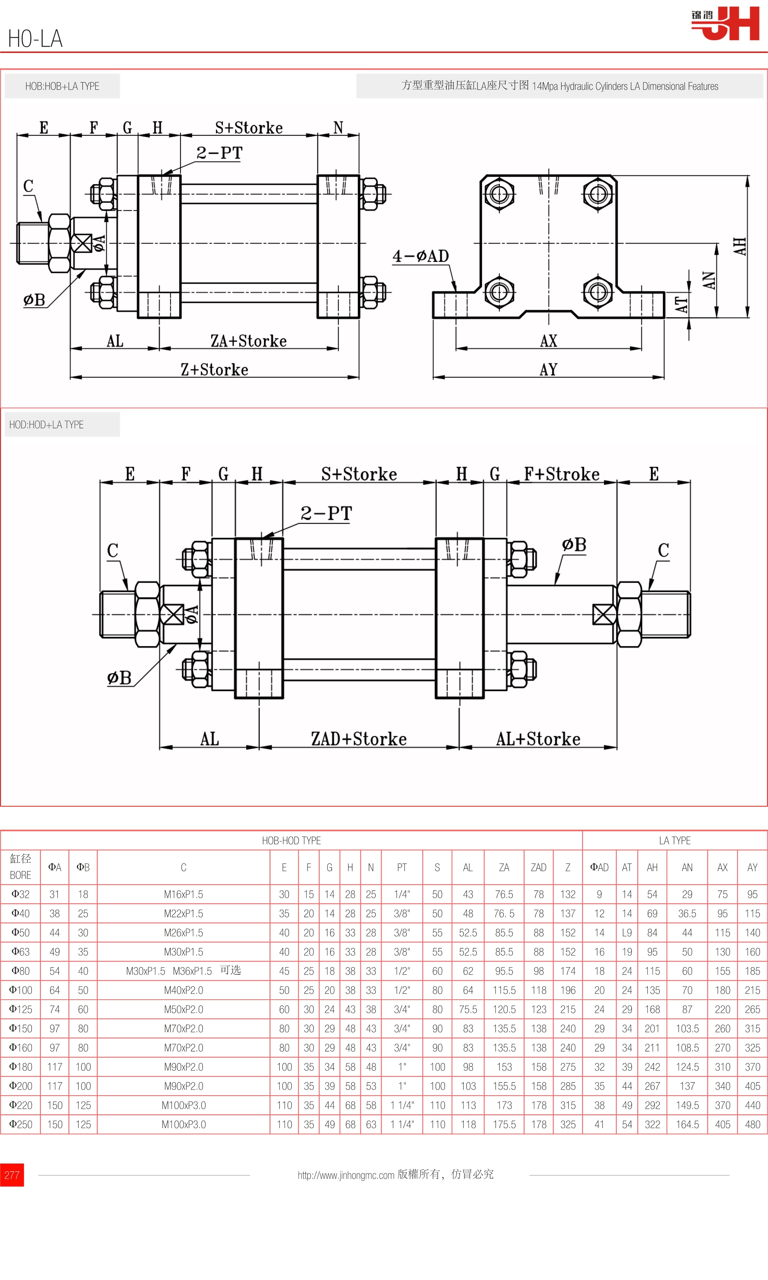 HOB:HOB+LA TYPE | 方型重型油壓缸LA座尺寸圖 14Mpa Hydraulic Cylinders LA Dimensional Features |