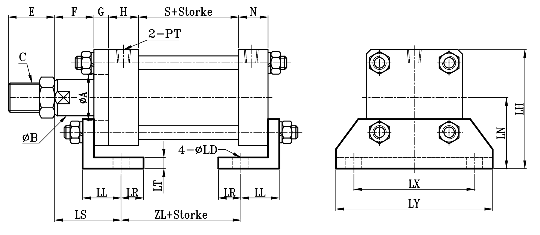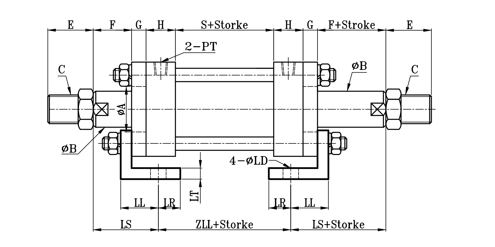 | 缸徑 BORE | ΦA | ΦB | C | E | F | G | H | N | PT | S | LS | ZL | ZLL | ΦLD | LH | LN | LL | LR | LT | LX | LY |