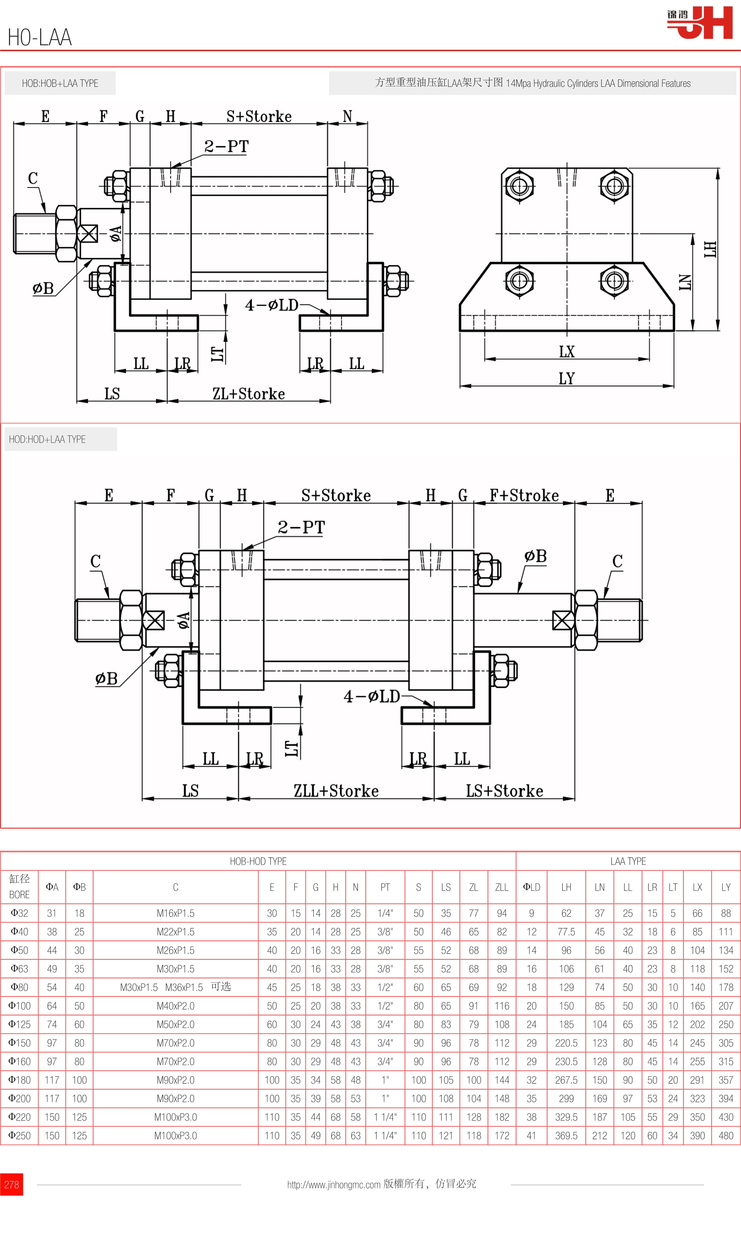 HOB:HOB+LAA TYPE | 方型重型油壓缸LAA架尺寸圖 14Mpa Hydraulic Cylinders LAA Dimensional Features |