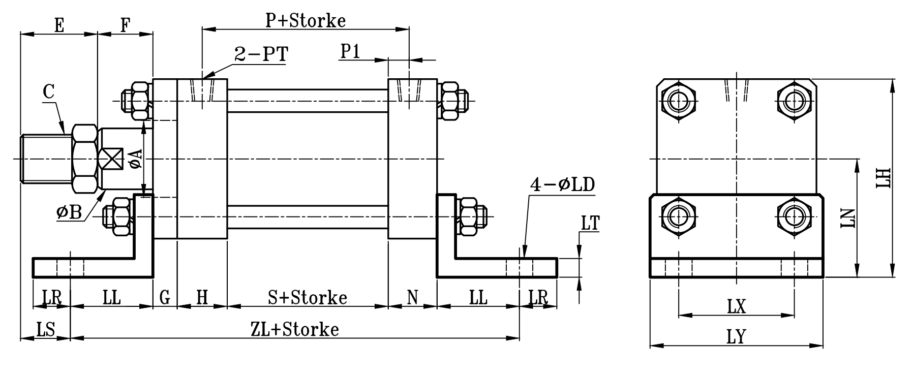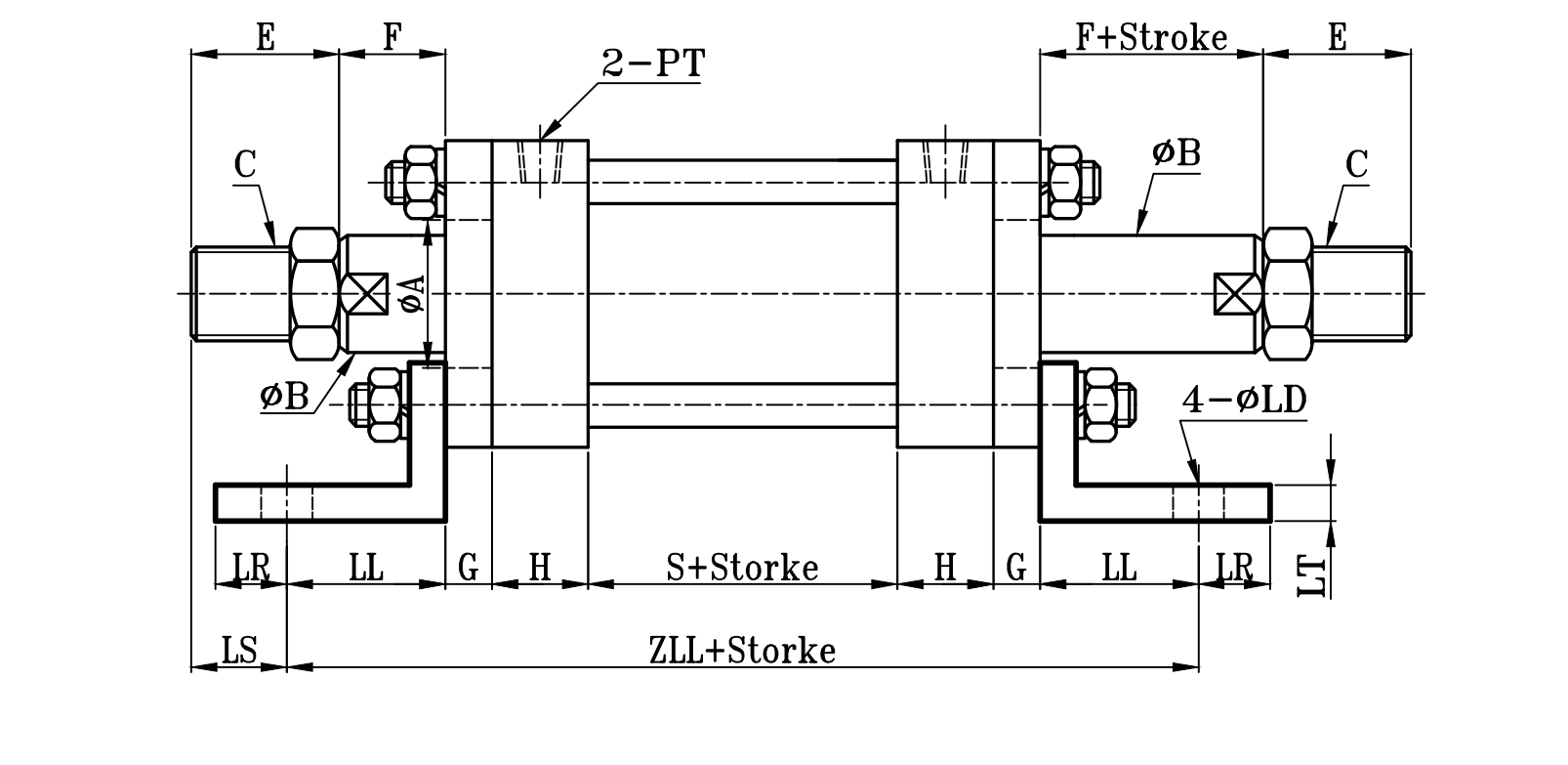 | 缸徑 BORE | ΦA | ΦB | C | E | F | G | H | N | P | P1 | PT | S | LS | ZL | ZLL | ΦLD | LH | LN | LL | LR | LT | LX | LY |