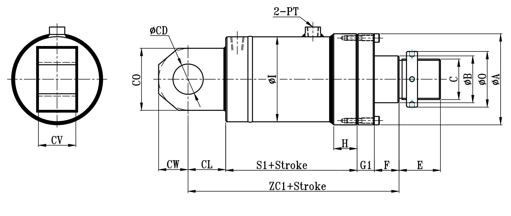 | 缸徑 BORE | ΦA | ΦB | C | H | ΦI | Φ0 | E | F | G | G1 | S | S1 | ZC | ZC1 | ΦCD | CV | CW | CL | CO | PT |
