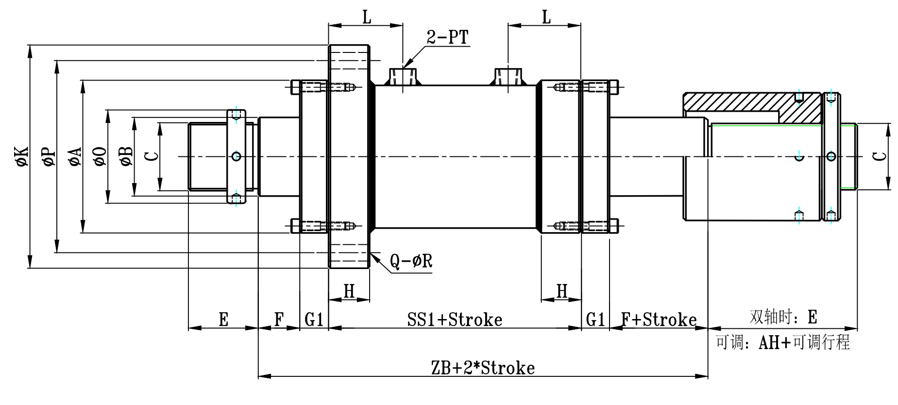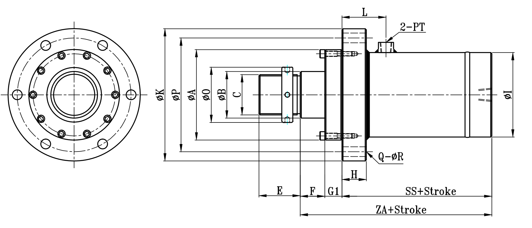 | 缸徑 BORE | ΦA | ΦB | C | L | H | ΦI | ΦK | ΦP | Φ0 | E | F | G1 | SS | SS1 | ZA | ZB | AH | Q | ΦR | PT |