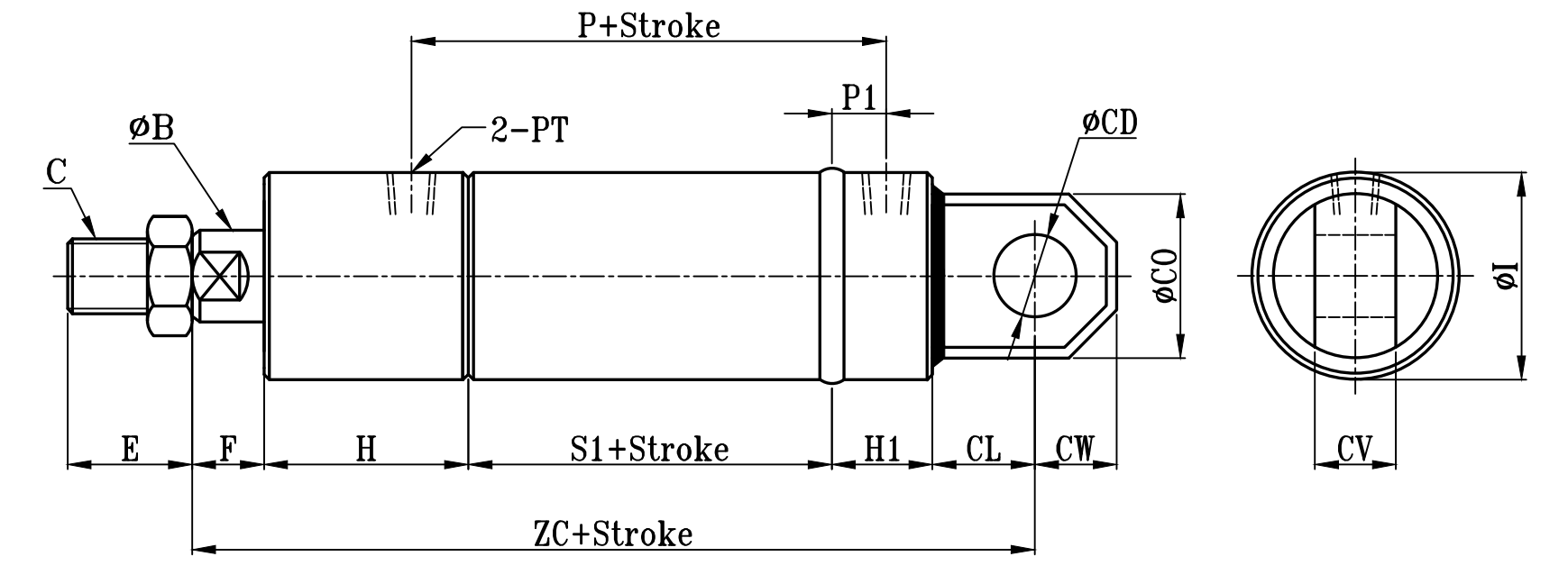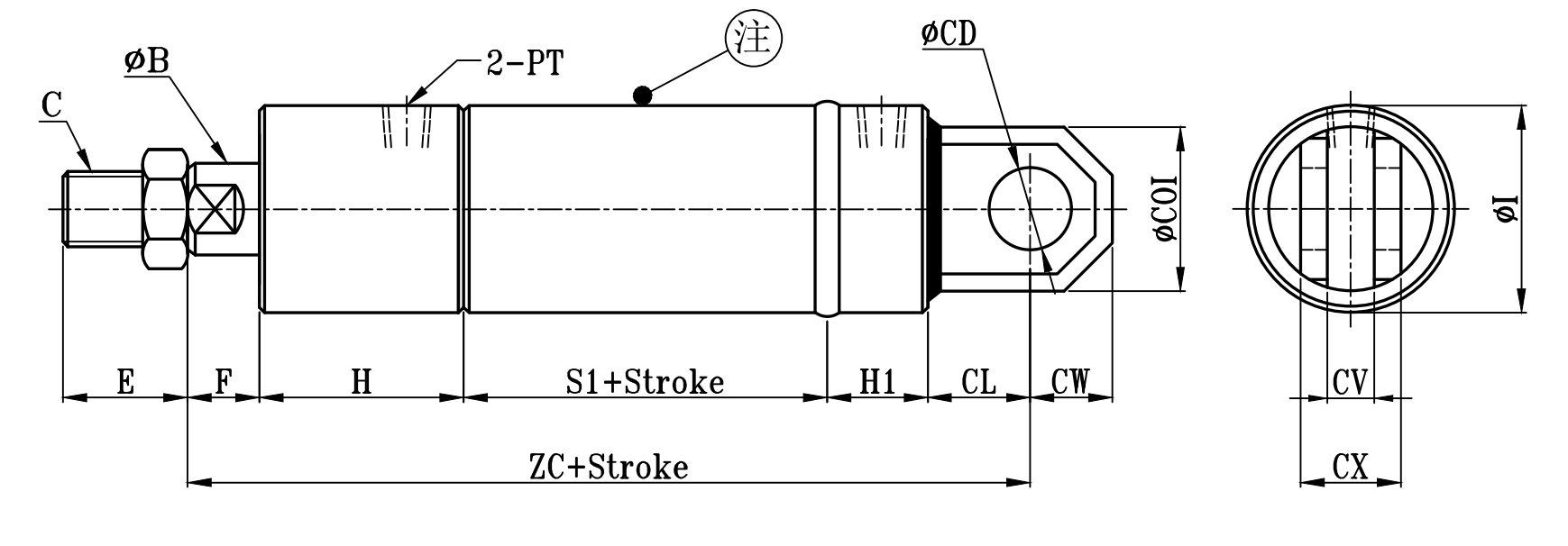 | 缸徑 BORE | ΦB | C | E | F | H1 | H | ΦI | P | P1 | PT | S1 | ZC | ΦCD | ΦCO | ΦCOI | CL | CW | CV | CX |