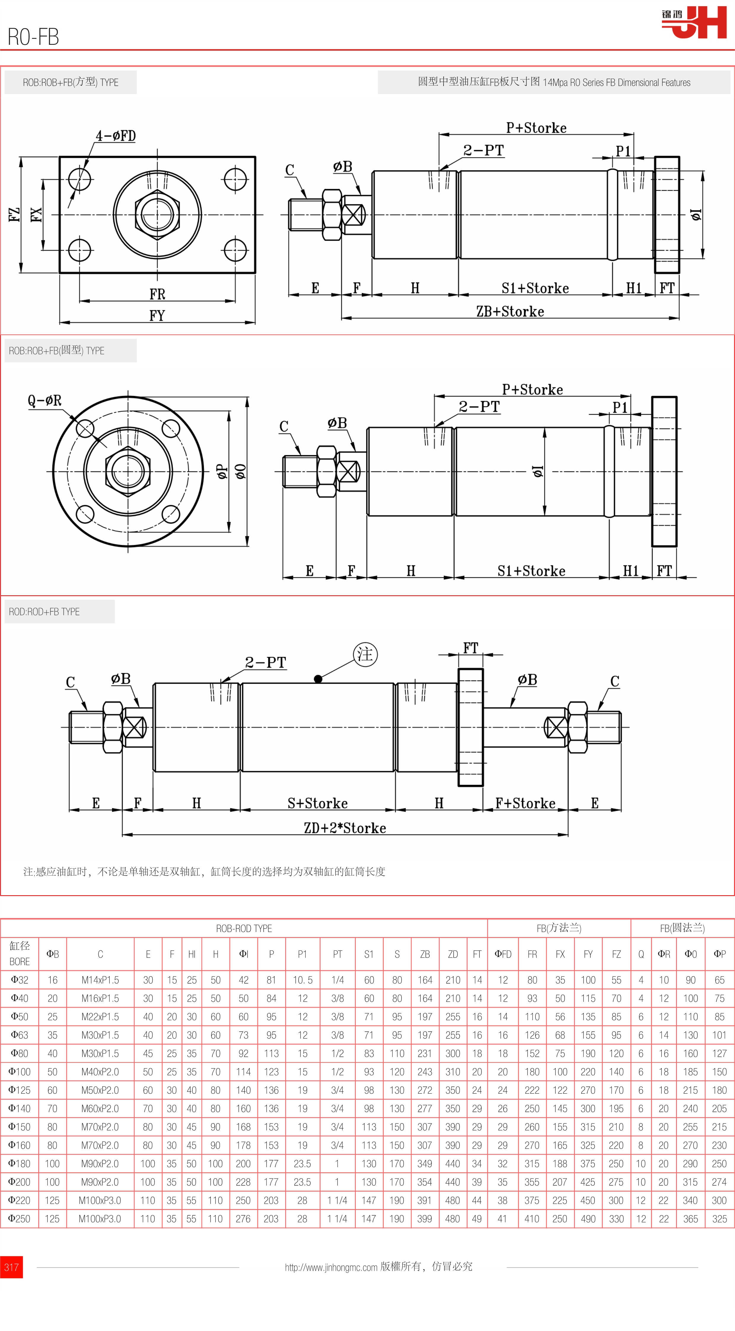 ROB:ROB+FB(方型) TYPE | 圓型中型油壓缸FB板尺寸圖 14Mpa R0 Series FB Dimensional Features |