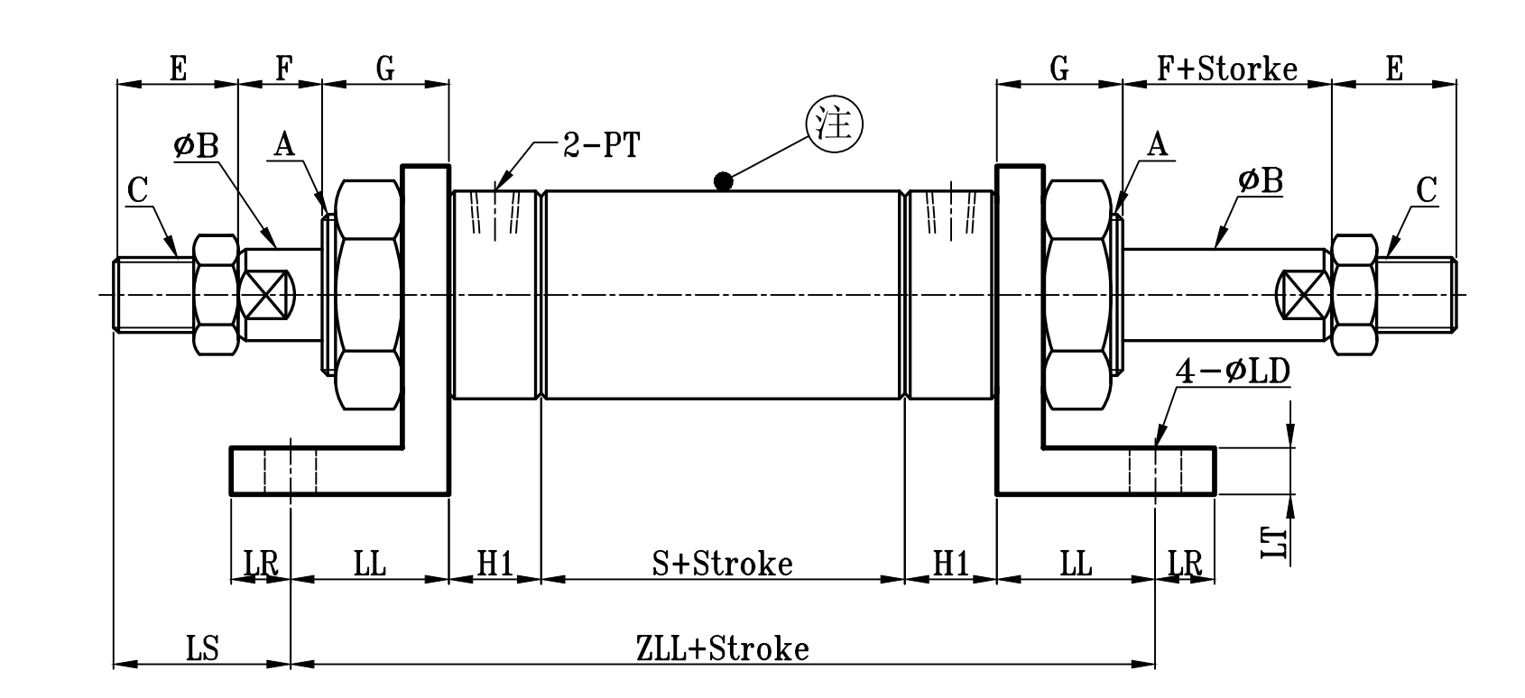 | 缸徑 BORE | A | ΦB | C | E | F | G | H1 | ΦI | P | P1 | PT | S1 | S | LS | ZL | ZLL | ΦLD | LT | LH | LN | LL | LR | LX | LY |