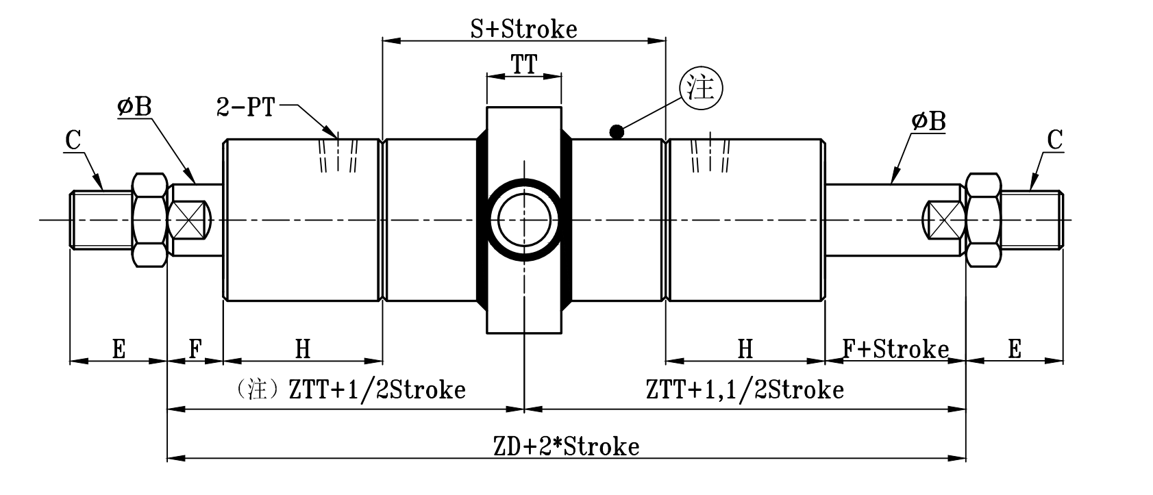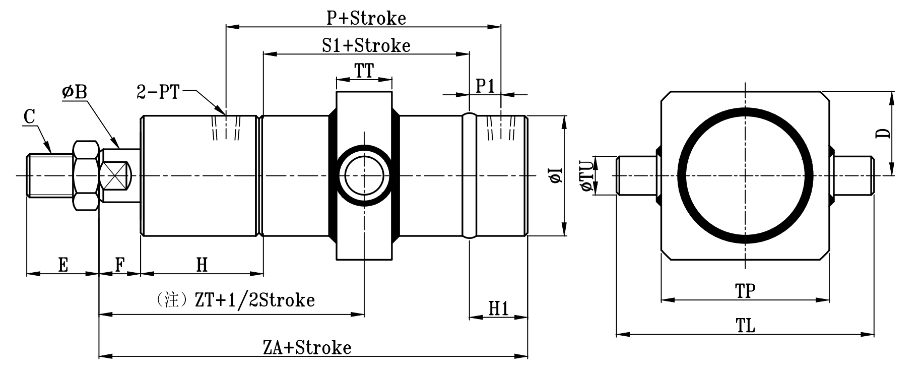 | 缸徑 BORE | ΦB | C | E | F | H1 | H | ΦI | P | P1 | PT | S1 | S | ZA | ZD | ZT | ZTT | ΦTU | TL | TP | TT | D |