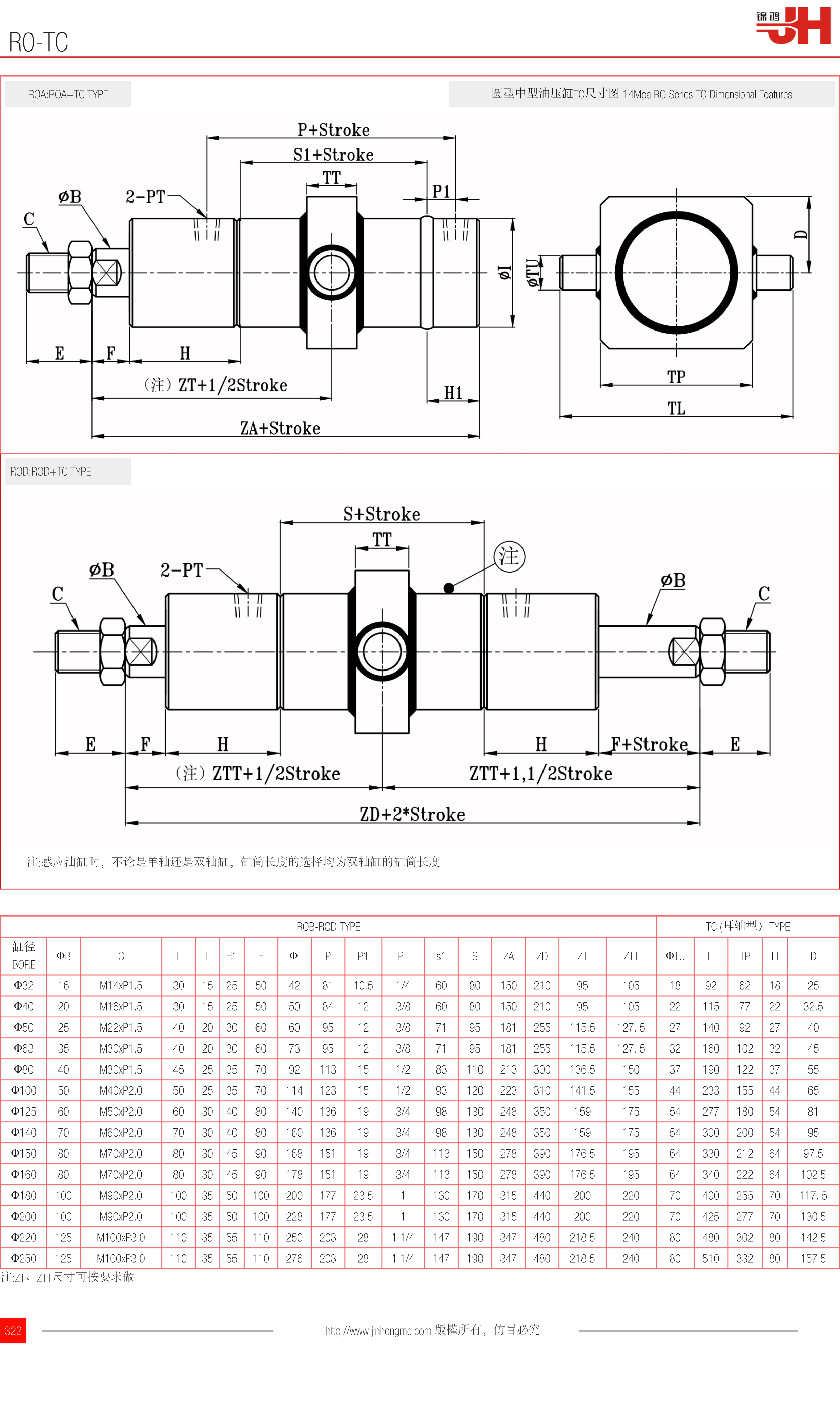 ROA:ROA+TC TYPE | 圓型中型油壓缸TC尺寸圖 14Mpa RO Series TC Dimensional Features |
