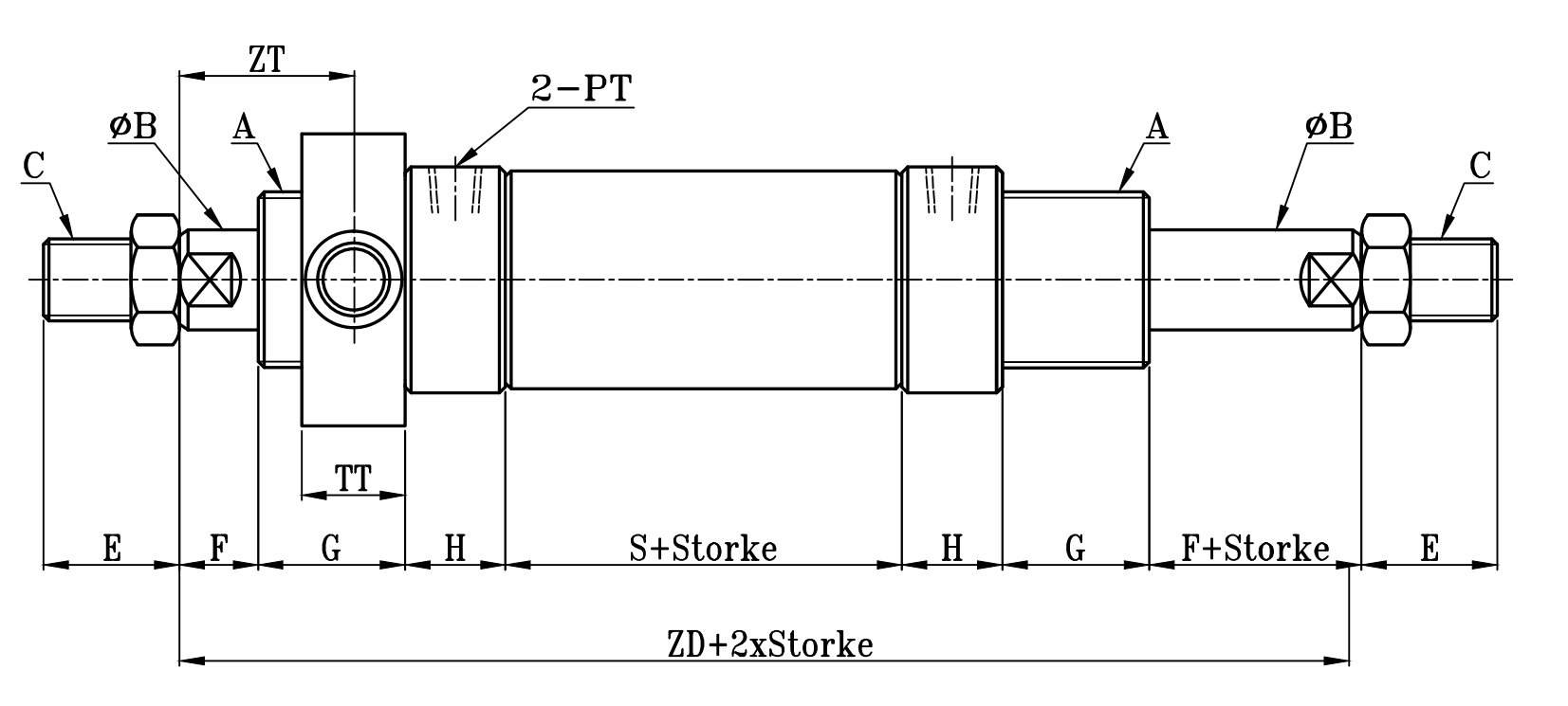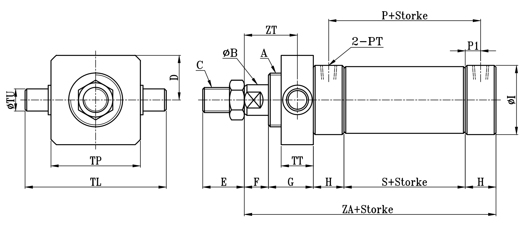 | 缸徑 BORE | A | ΦB | C | E | F | G | H | ΦI | P | P1 | PT | S | ZA | ZD | ZT | TL | TP | TT | ΦTU | D |