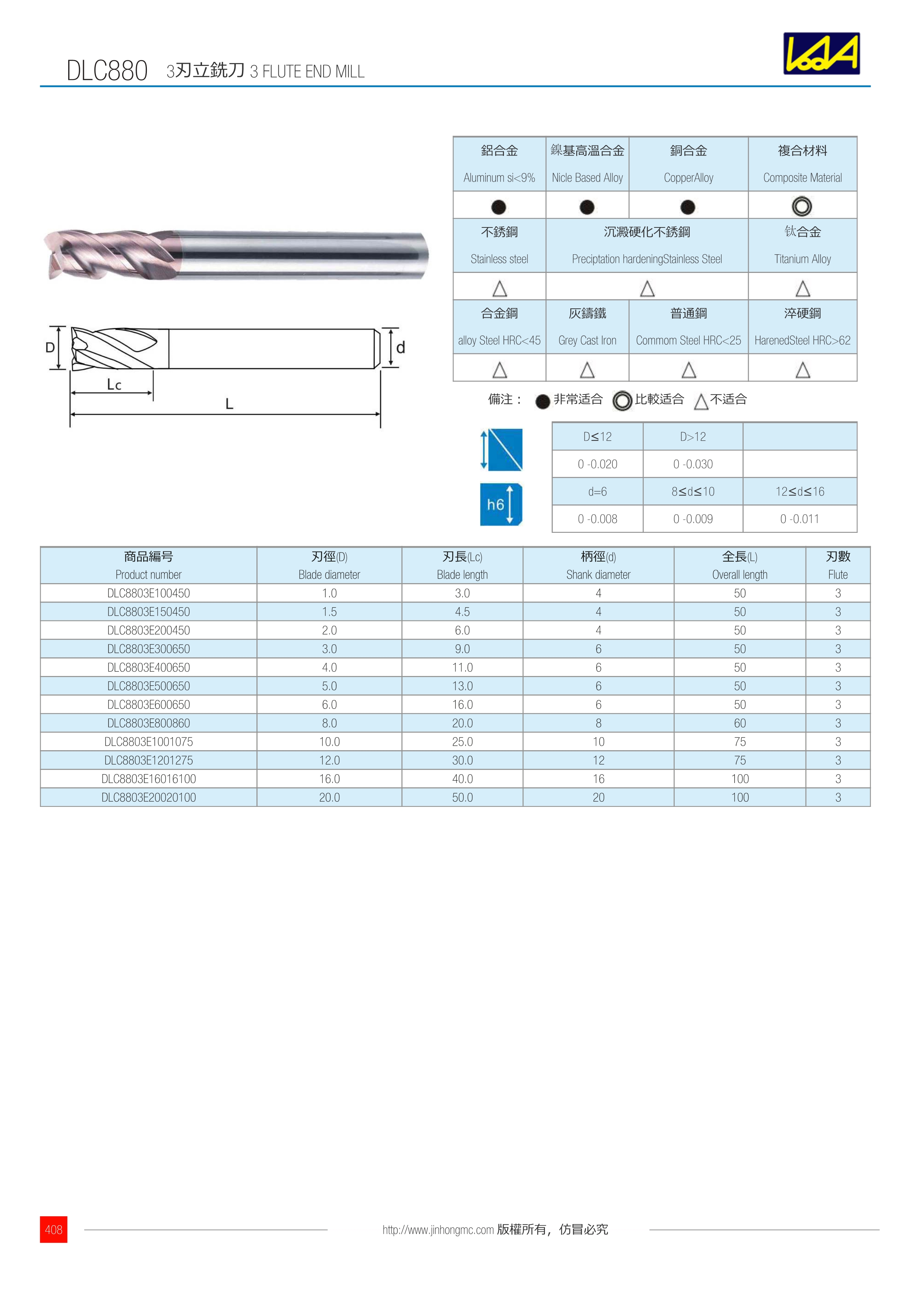 | 商品編號 Product number | 刃徑(D) Blade diameter | 刃長(Lc) Blade length | 柄徑(d) Shank diameter | 全長(L) Overall length | 刃數 Flute |