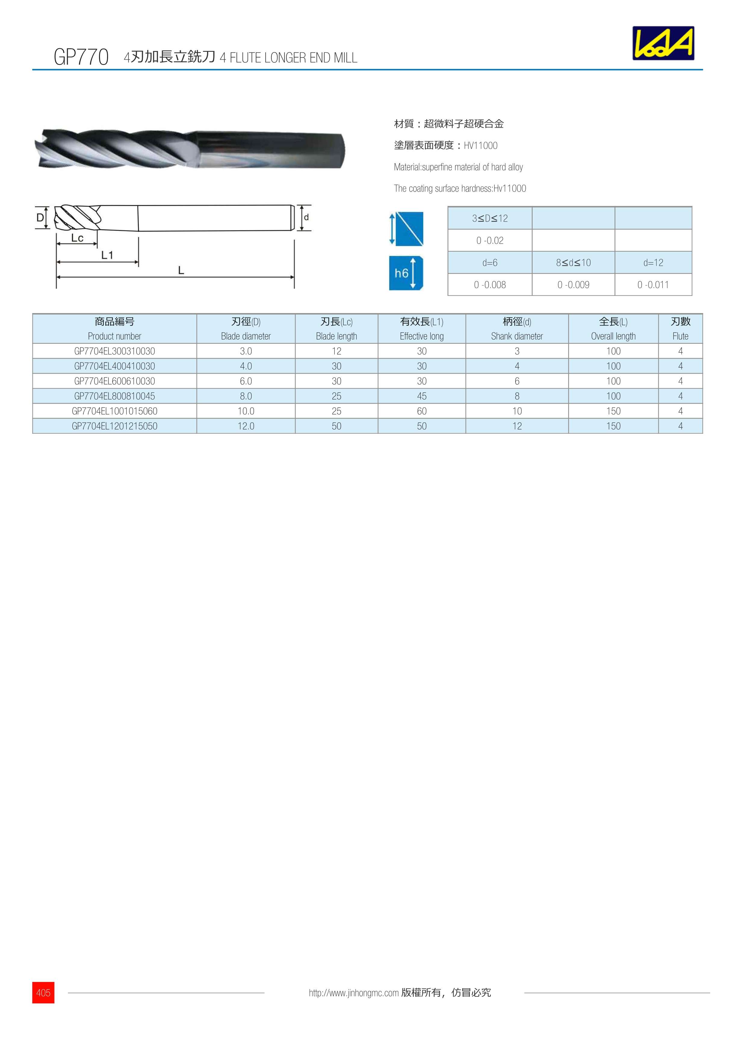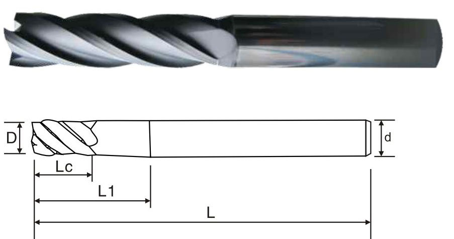| 商品編號 Product number | 刃徑(D) Blade diameter | 刃長(Lc) Blade length | 有效長(L1) Effective long | 柄徑(d) Shank diameter | 全長(L) Overall length | 刃數 Flute |