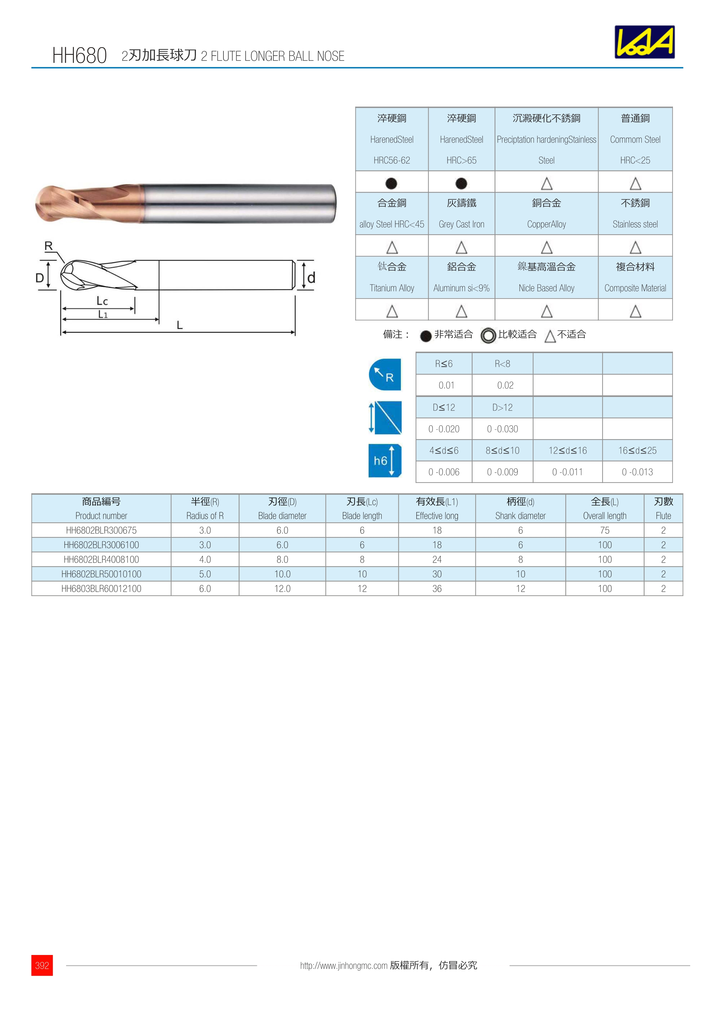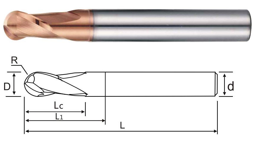 | 商品編號 Product number | 半徑(R) Radius of R | 刃徑(D) Blade diameter | 刃長(Lc) Blade length | 有效長(L1) Effective long | 柄徑(d) Shank diameter | 全長(L) Overall length | 刃數 Flute |