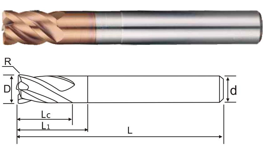 | 商品編號 Product number | 刃徑(D) Blade diameter | R角 R angle | 刃長(Lc) Blade length | 有效長(L1) Effective long | 柄徑(d) Shank diameter | 全長(L) Overall length | 刃數 Flute |