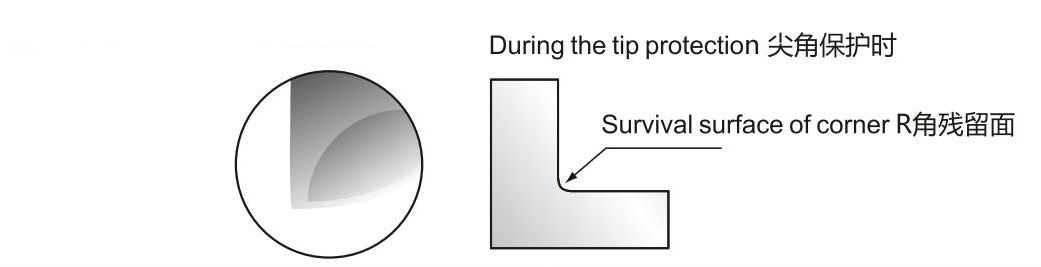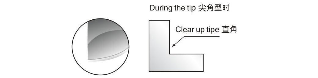 ![]() | Use for clear up tipe.工作直角進使用。 Sharp tip,easy to break.尖角部鋒利,但易崩刀。 Can be use in carbone steel and steel,specially using in Aluminum and non-ferrous material .碳素鋼和調質鋼也能使用,尤其廣泛應用于鋁材等非鐵材質的加工,對于高硬度的工作,因崩刀而無法適用。 |