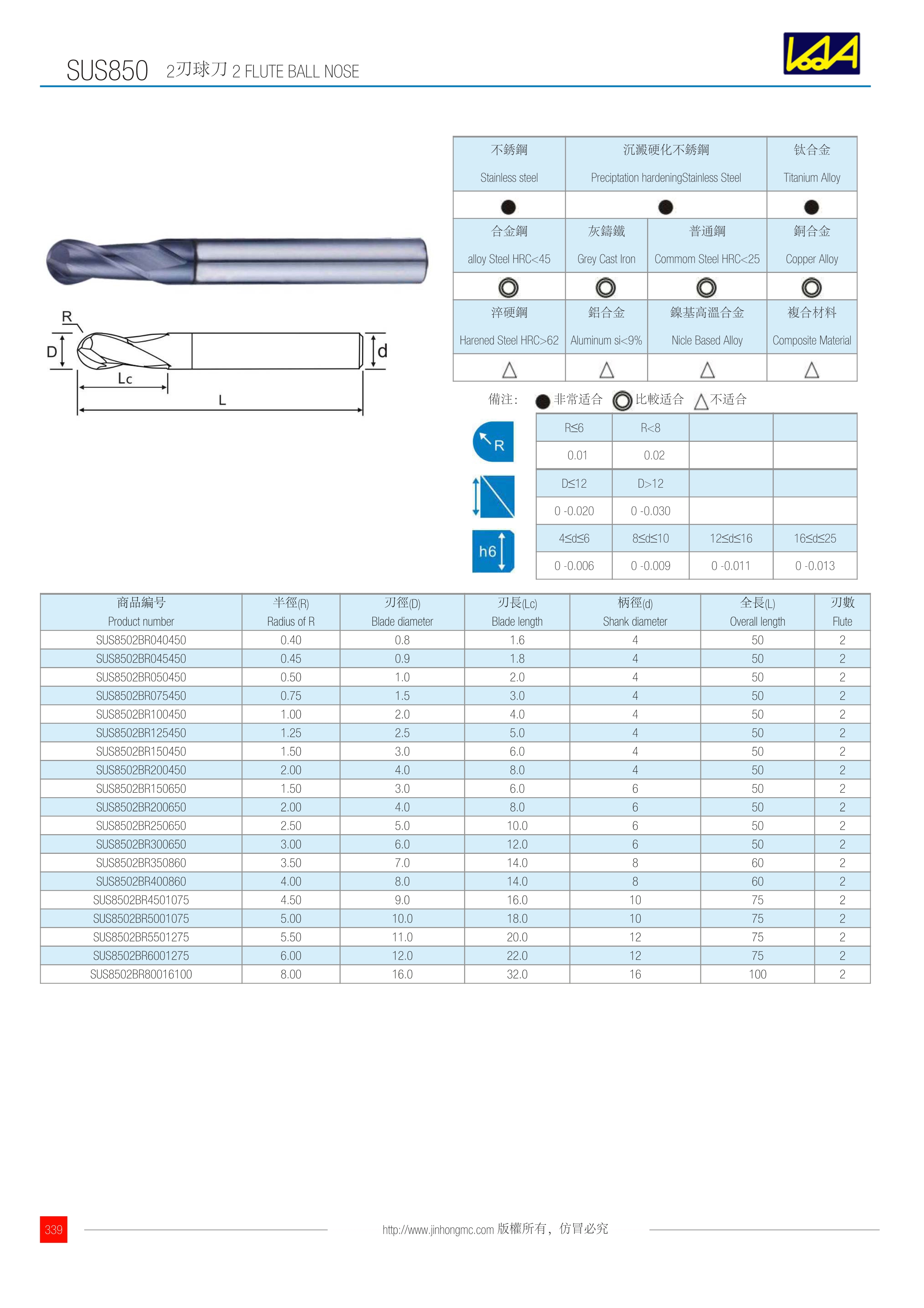 | 商品編號 Product number | 半徑(R) Radius of R | 刃徑(D) Blade diameter | 刃長(Lc) Blade length | 柄徑(d) Shank diameter | 全長(L) Overall length | 刃數 Flute |